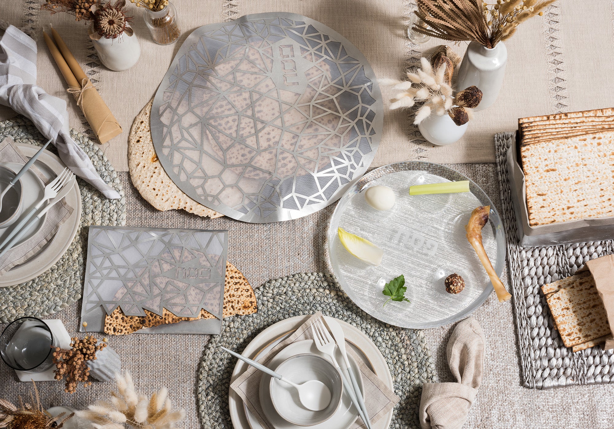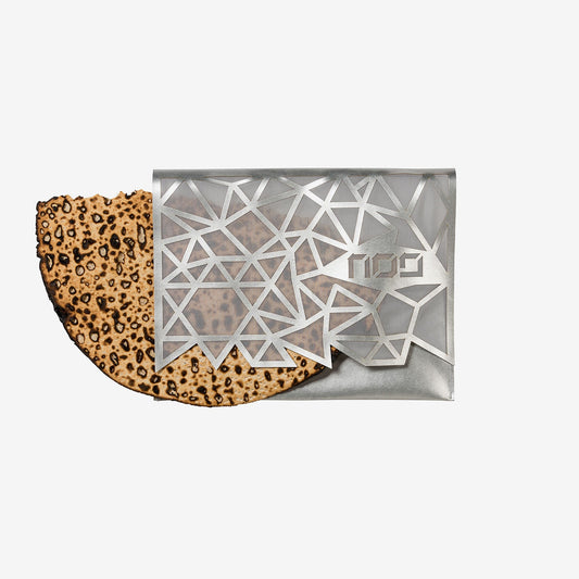 An industrial aesthetic with geometric Matzah Cover and Afikomen bag. This bold look redefines traditional settings with a sharp, contemporary edge.